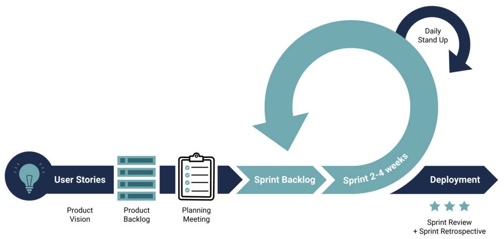 Scrum är ett agilt ramverk som hjälper team att arbeta i korta, fokuserade arbetscykler som kallas “sprintar”. Varje sprint varar mellan två till fyra veckor och under denna tid arbetar teamet mot ett specifikt mål. Grundtanken är att göra arbetet mer transparent, dynamiskt och flexibelt för att kunna anpassa sig snabbt till förändringar.